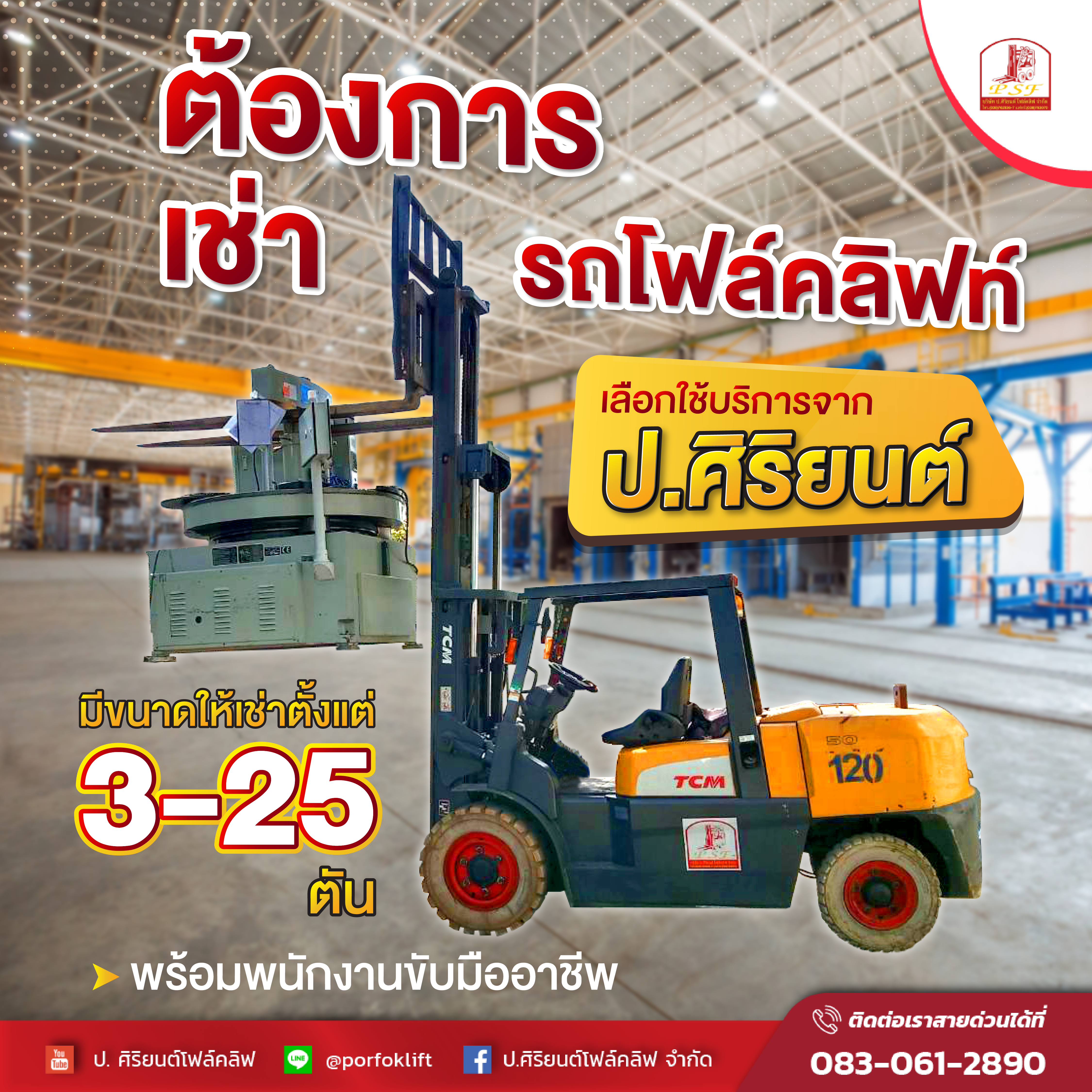 Por Siriyont Forklift Co., Ltd. offers a wide range of forklift rentals starting from 5 tons and above. We provide daily and monthly forklift rental services, as well as forklift rentals with certified operators. In addition to forklifts, we also offer man lift rentals, crane rentals, and trailer rentals. Our services cover all districts of Chonburi including Phanat Nikhom, Phan Thong, Ban Bueng, Si Racha, Ko Chan, Bo Thong, Nong Yai, Bang Lamung, Sattahip, Ko Si Chang, Chanthaburi, Trat, Rayong, and nearby areas.