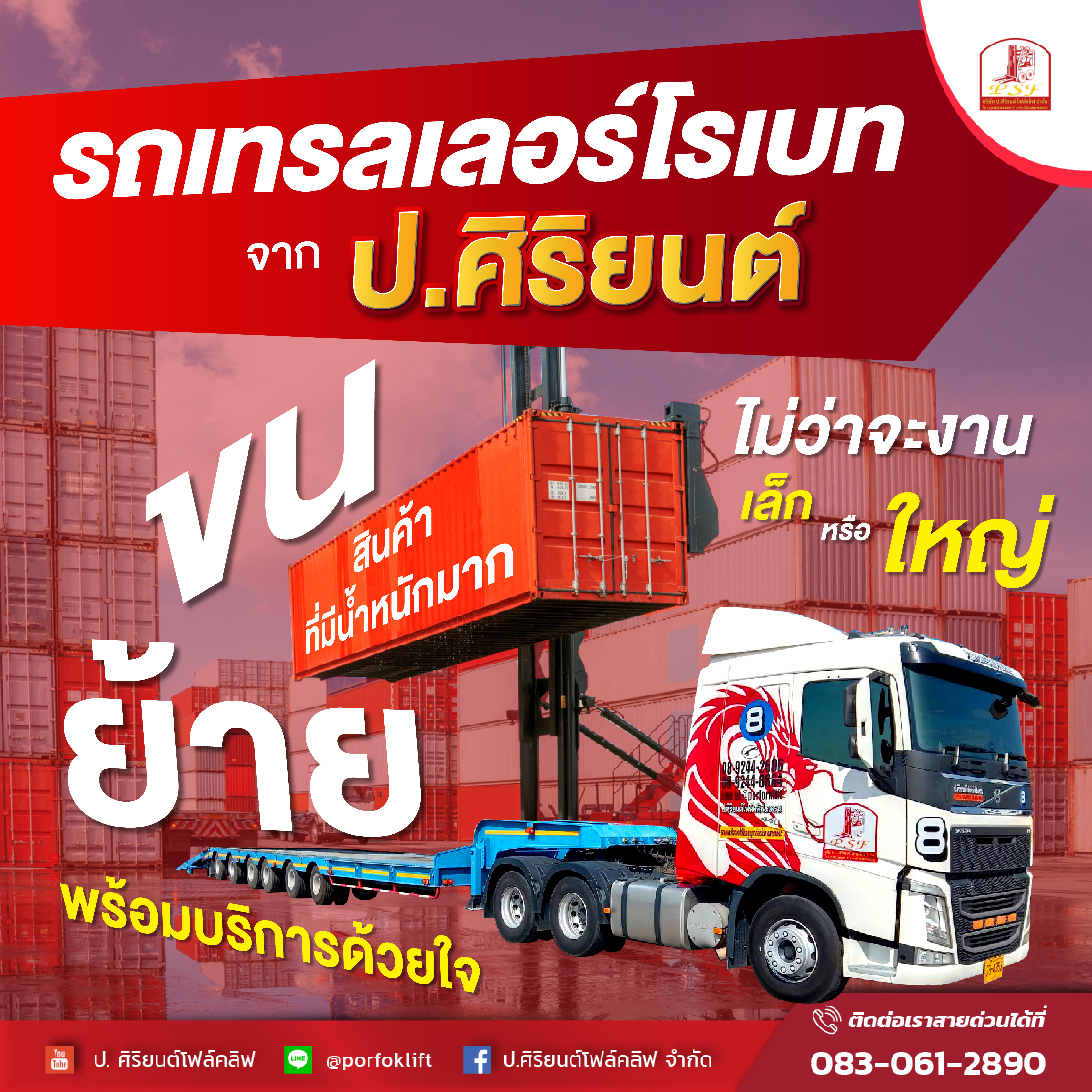 Por Siriyont Forklift Co., Ltd. offers trailer rentals, lowbed trailers, forklift rentals, man lift rentals, and crane rentals for construction projects, architectural works, structural engineering, as well as film production and performances. We also provide forklift rentals with licensed operators across Thailand. With years of experience, Por Siriyont Forklift Co., Ltd. has earned trust across various industries, factories, and businesses. Our fleet of forklifts, cranes, man lifts, and trailers is regularly inspected and maintained to ensure quality and performance in every operation.